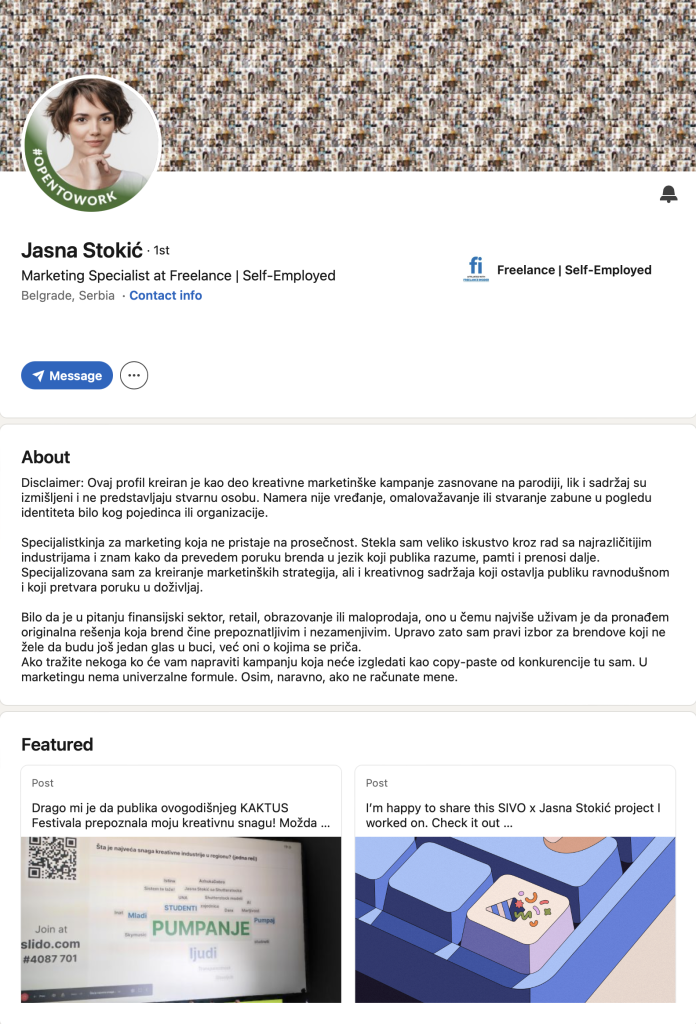Da bi odgovorili na ovo pitanje, zaposleni u kreativnoj agenciji SIVO su ženi bez identiteta dodelili ime, prezime i profesiju marketing specijalistkinje. Sa ciljem da ukažu na rastući problem korišćenja generičkih oglasnih rešenja, za koja se brendovi sve češće odlučuju, kreirali su LinkedIn profil pod imenom Jasna Stokić. Na njen profil stigli su pozivi za konekcije od strane stručnjaka iz reklamne industrije, dok su postovi na temu kampanja u kojima je učestvovala dobili brojne impresije.